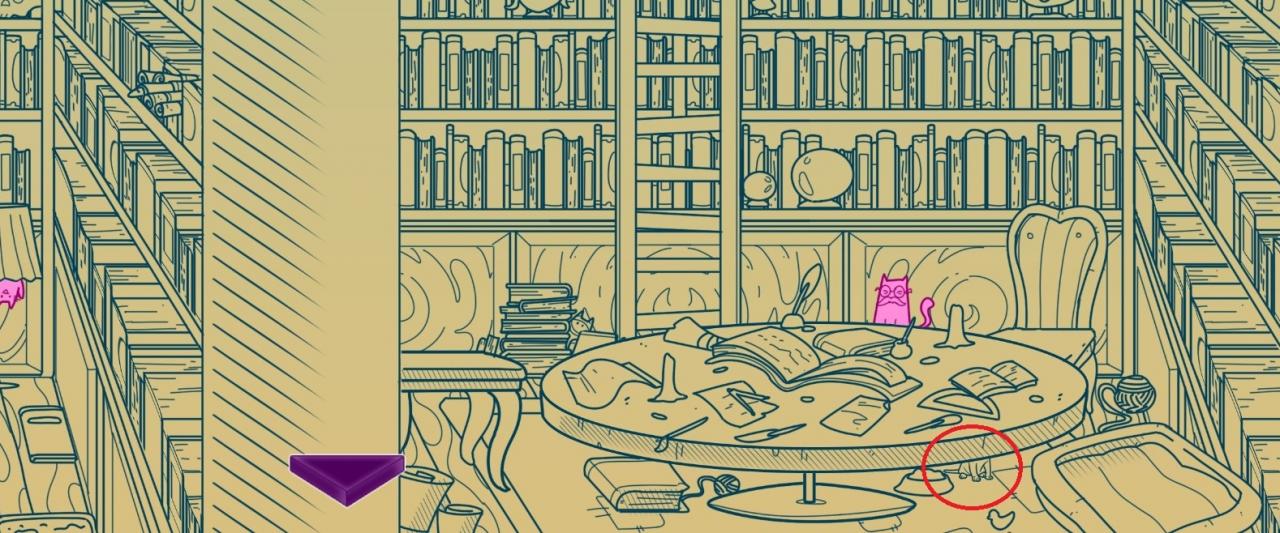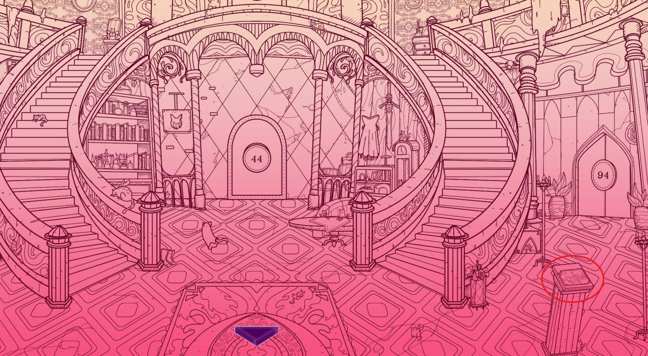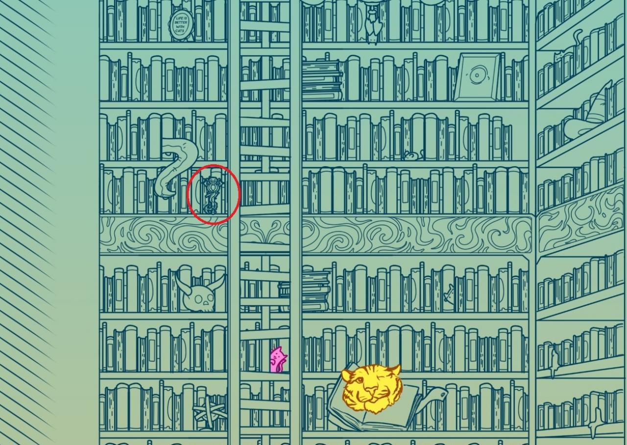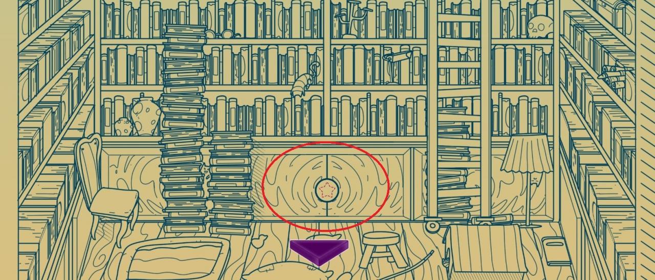 Then, go to the library. In the middle of the room, you can place the key on a cupboard. The passage will open here.