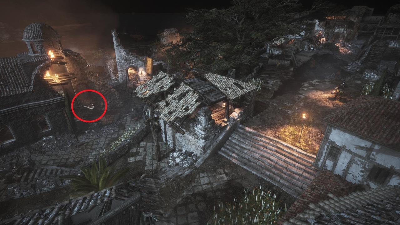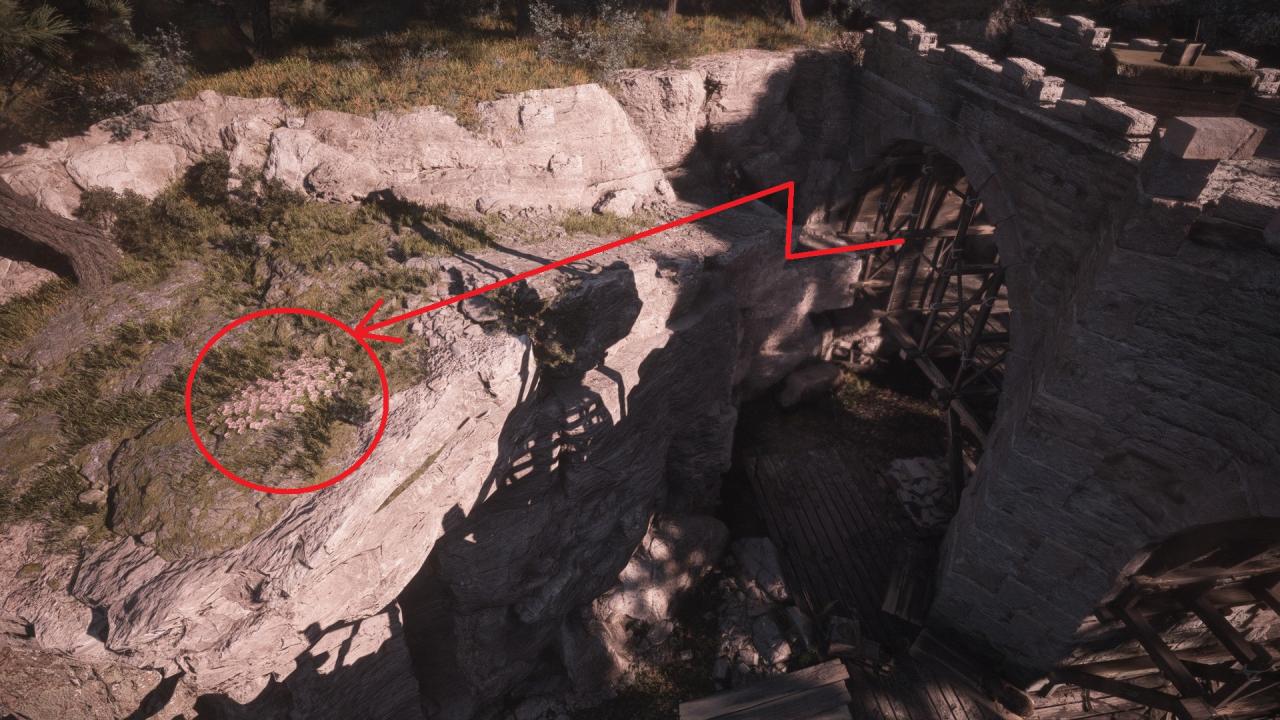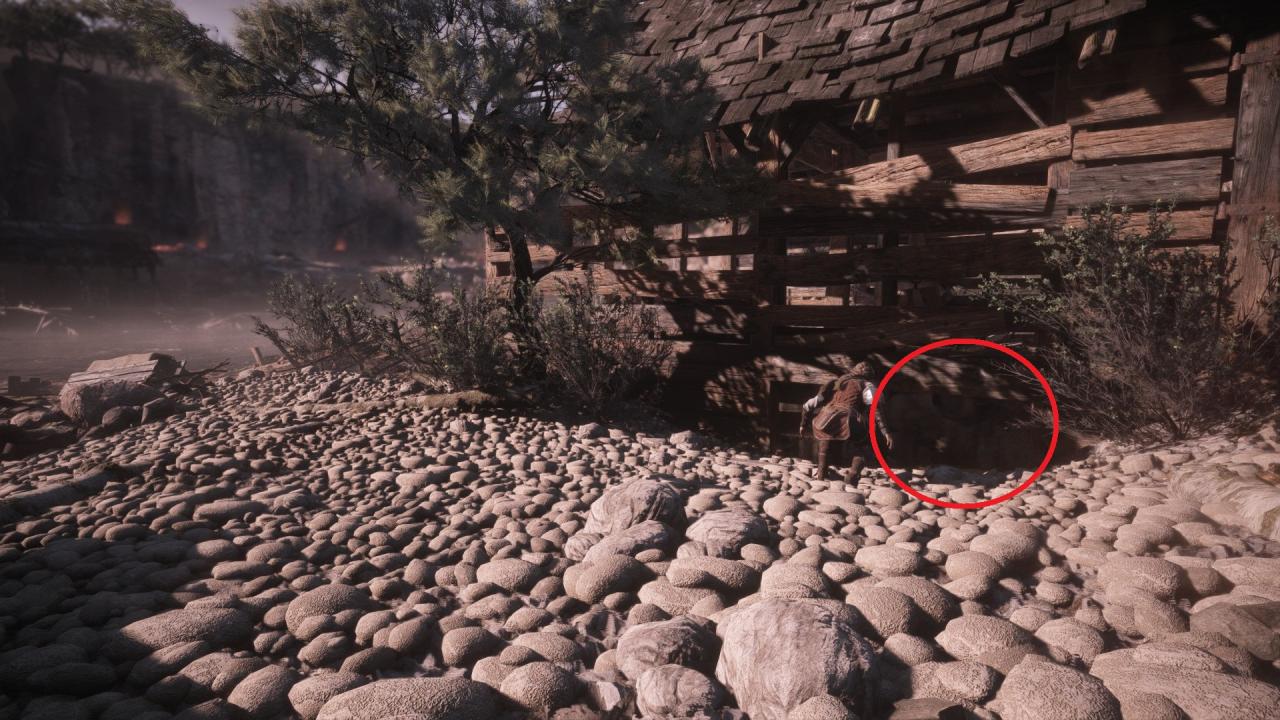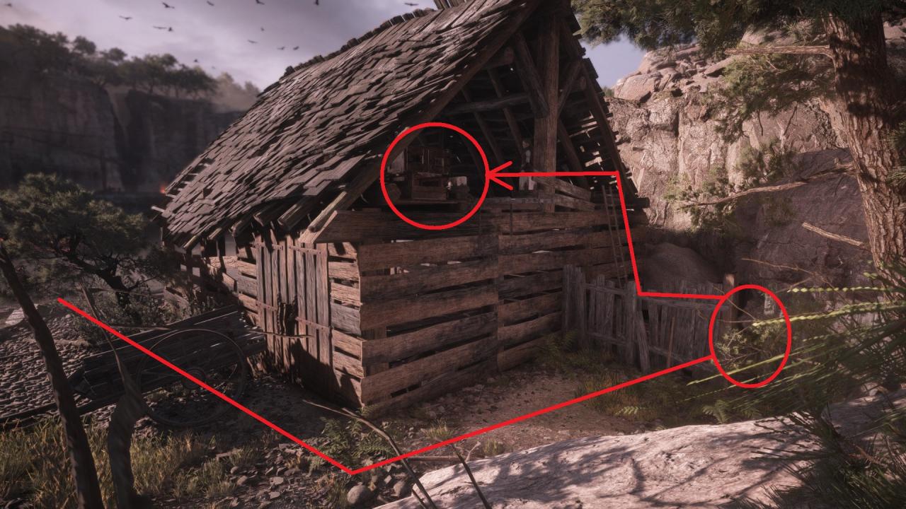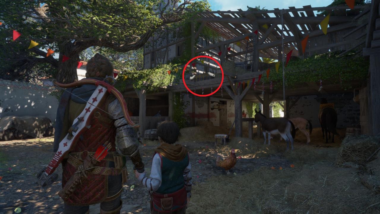 Can be collected during objective “Reach the herbalist’s forest”, right after exiting the town through the gate. Walk down the path to the first house (where the first workbench can be found) and head towards the second house to the right, with a locked gate. Go around the fence and unlock the gate by using your slingshot to break the lock.