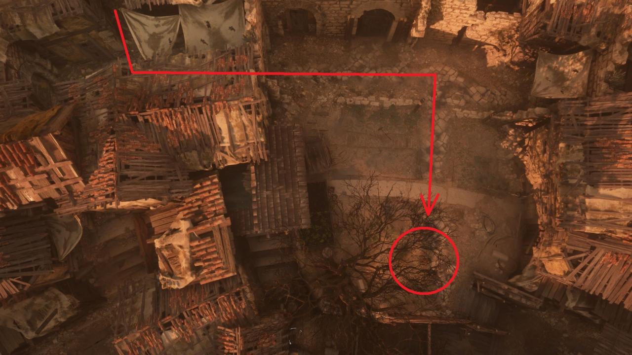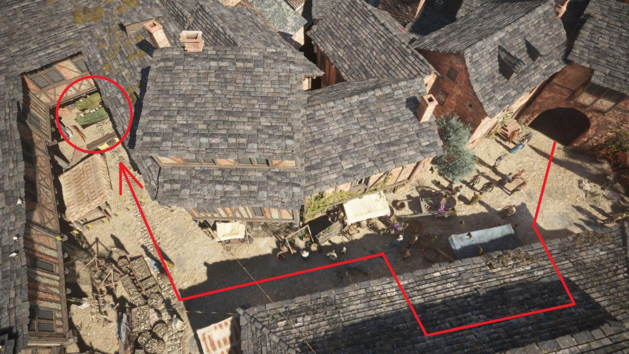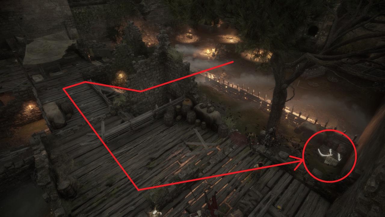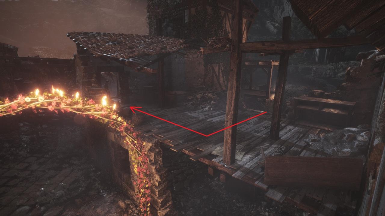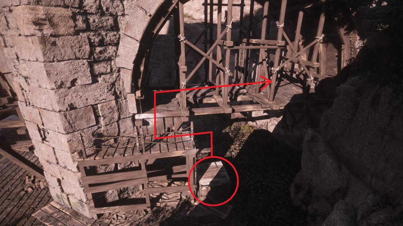 Can be collected during objective “Reach the herbalist’s forest”, right after exiting the town through the gate. Walk down the path to the first house (where the first workbench can be found) and head towards the second house to the right, with a locked gate. Go around the fence and unlock the gate by using your slingshot to break the lock.