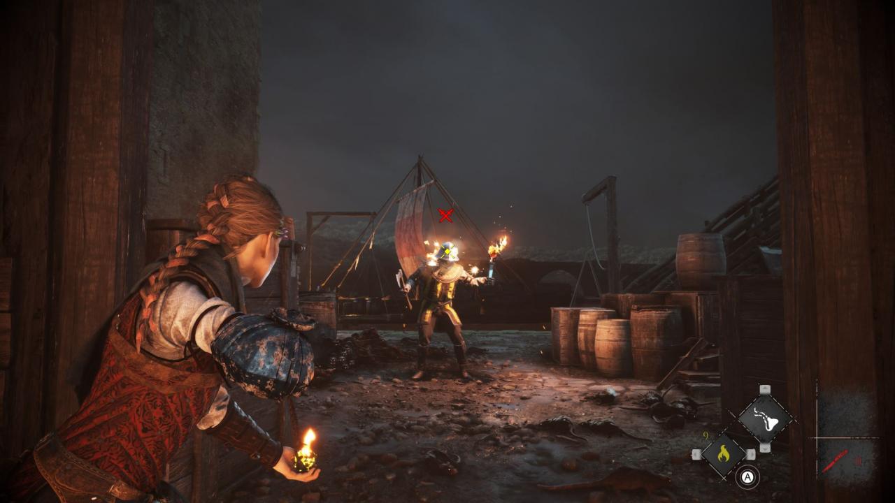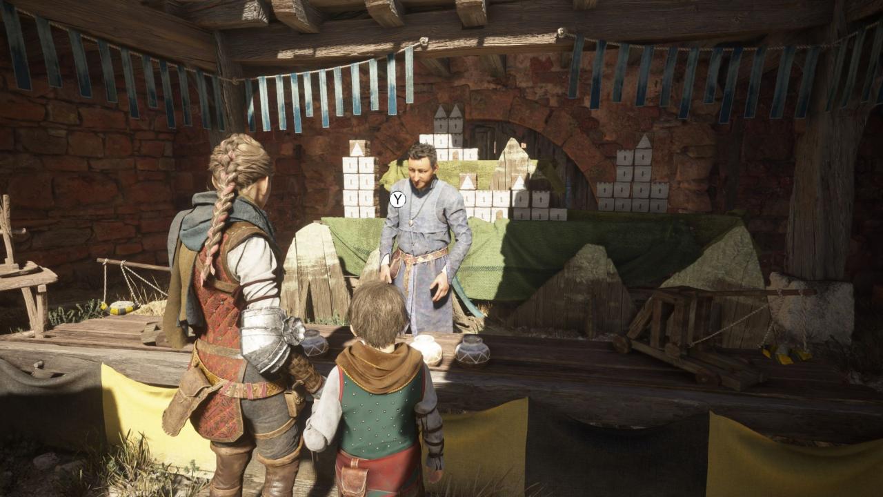Go to the game stand and interact with it in order to begin the mini-game. Throw the 4 pots in the 4 towers of cubes and knock down all of them. The souvenir will be collected once Amicia wins and is declared the best player of the day.