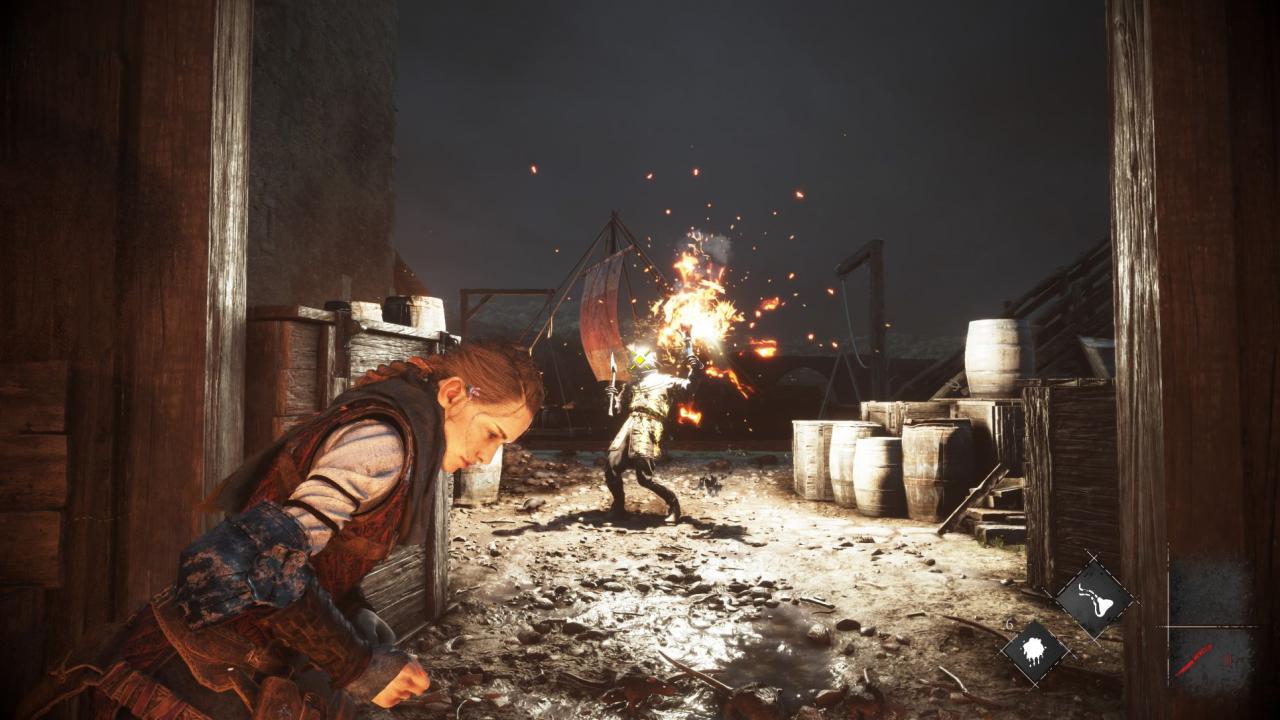 2. Use the slingshot directly with the Tar ammo on the torch that the soldier holds to light up the area and make the rats go away so that you can safely run past the soldier and exit to the next area.