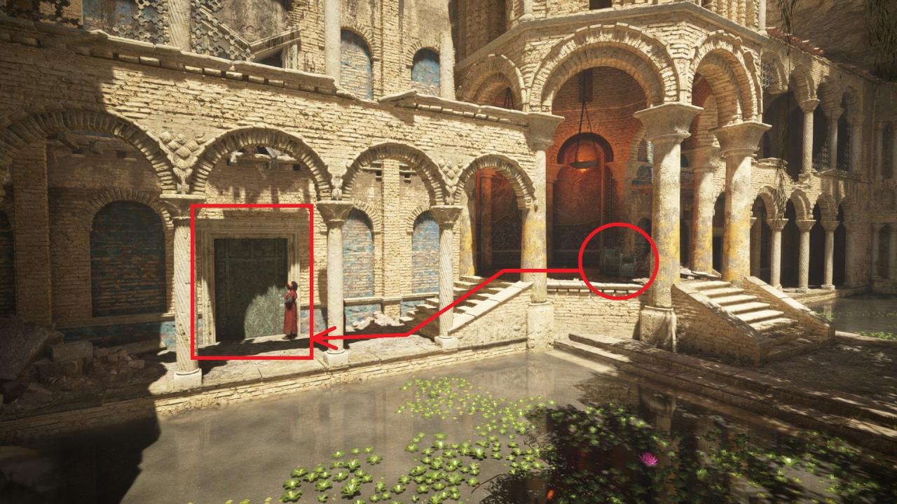 Walk towards the door and open it. To the right there will be the last secret chest.
