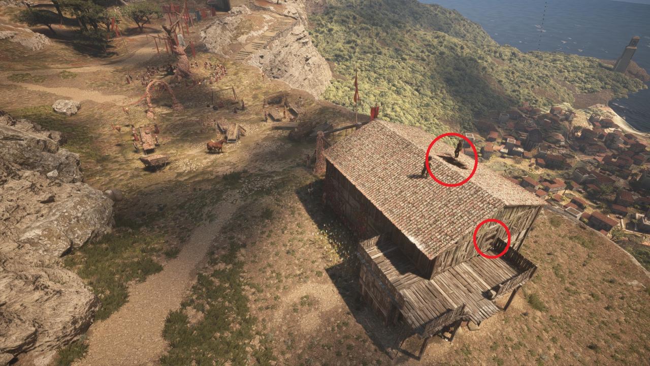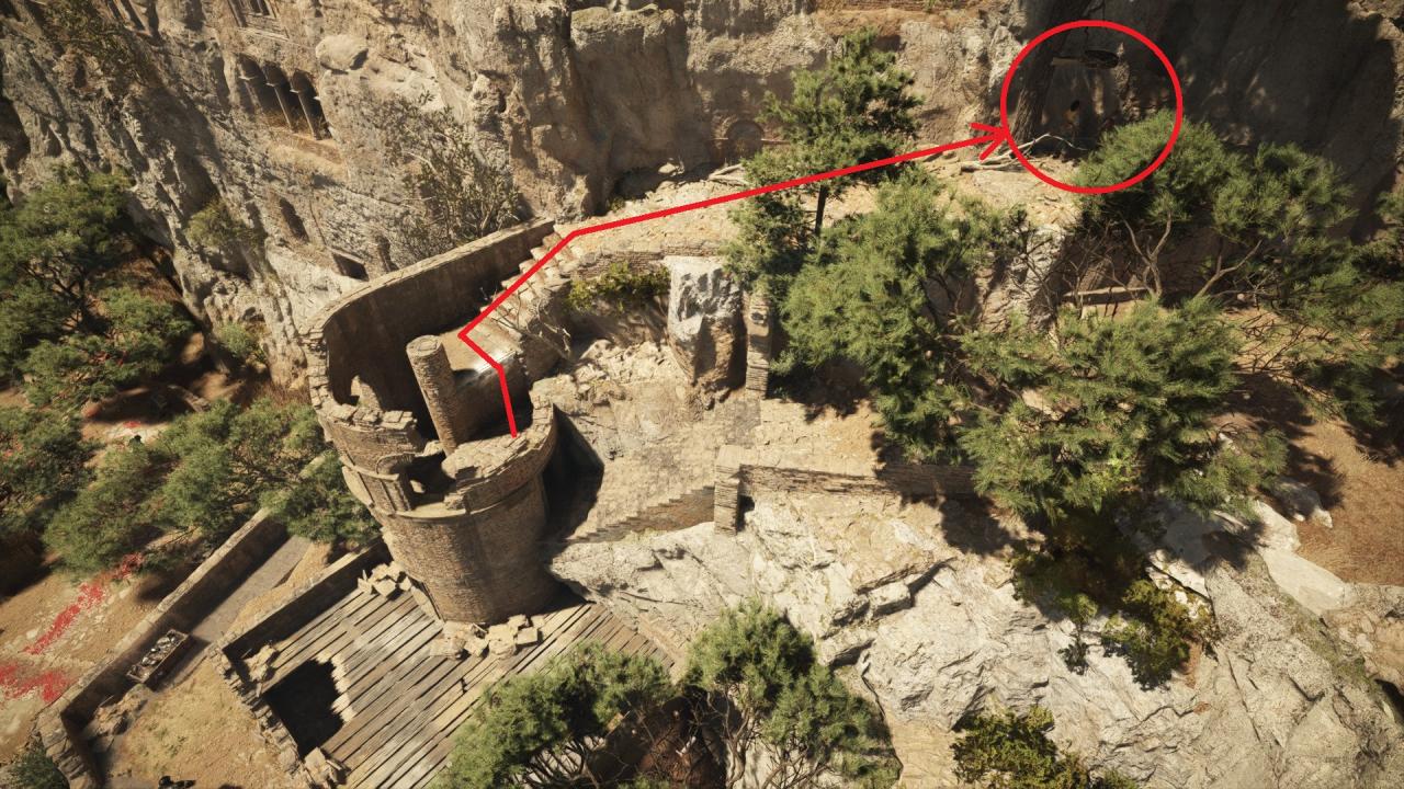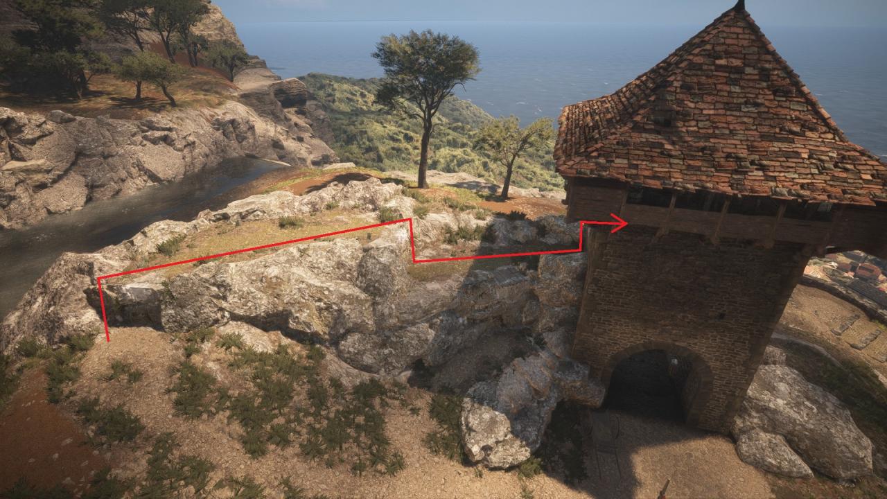 Head inside the tower and climb up to the top level. An interact will be available on the ledge facing the sea.