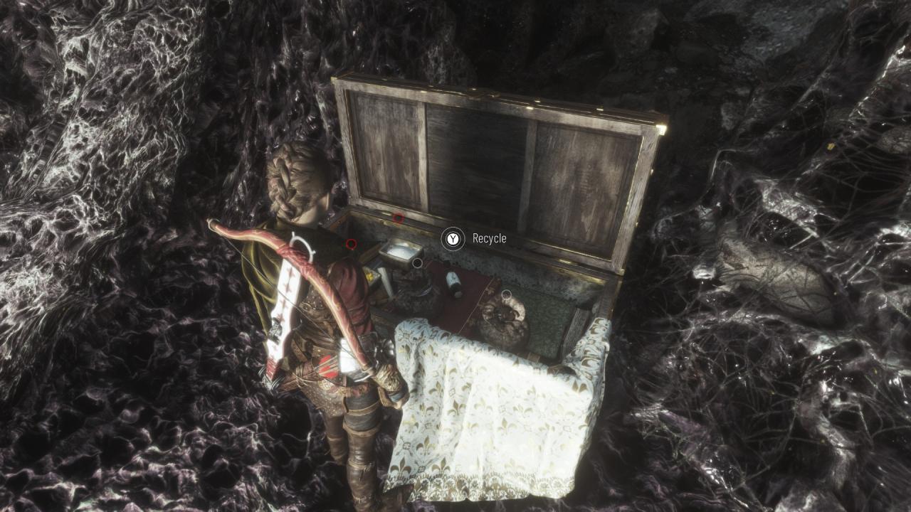 – Pieces are crafting materials found scattered in the world, but they also can be obtained by scraping extra materials/ammunition (if you run out of space in your pocket) if you have the “Instruments” upgraded at level 1.