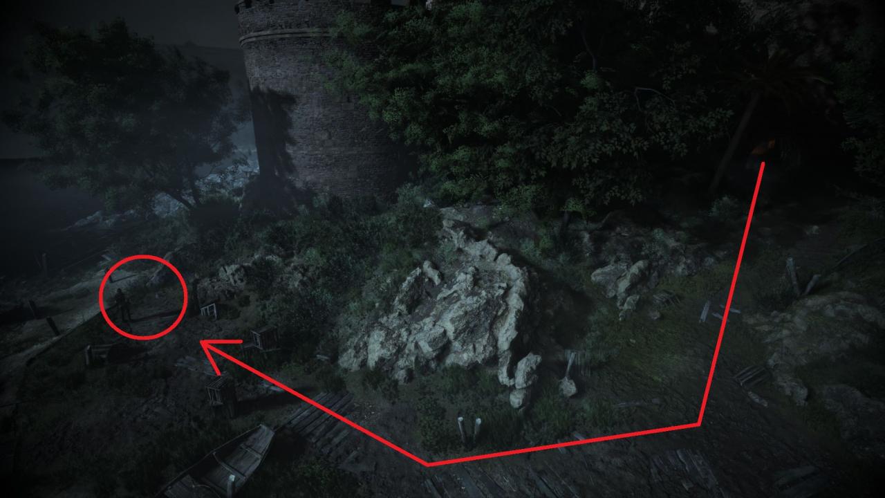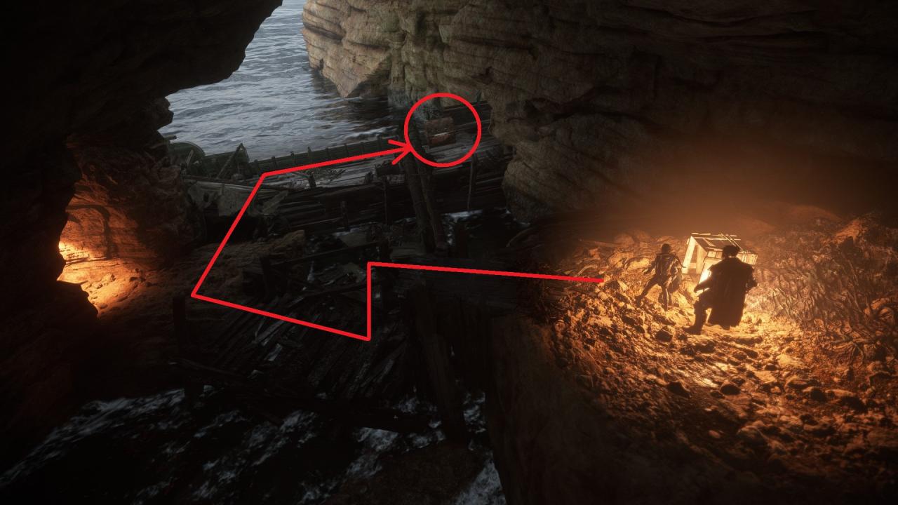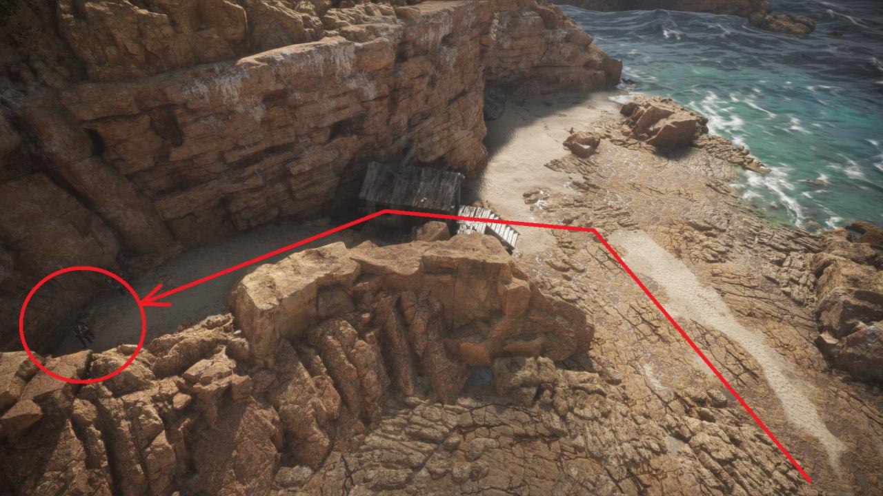 Can be collected during sub-chapter “Passage in the caves”, objective “Find the smuggler’s hideout”, after escaping from the rats’ nest and reaching the beach. To the left you will see a shipwreck with a workbench inside it. Continue forward hugging the left wall (after passing the shipwreck) until you find a cliff that can be climbed on. Go up and head back towards the shipwreck. Here you will see an interact facing the ship.