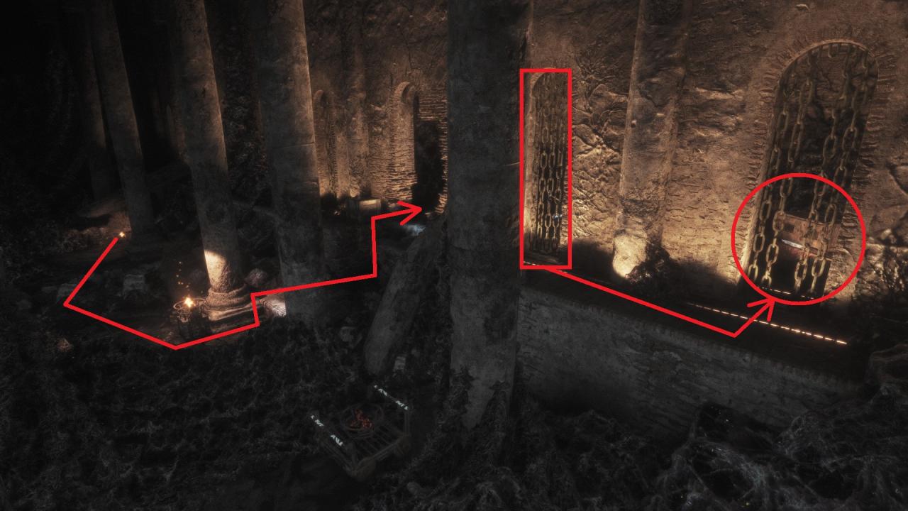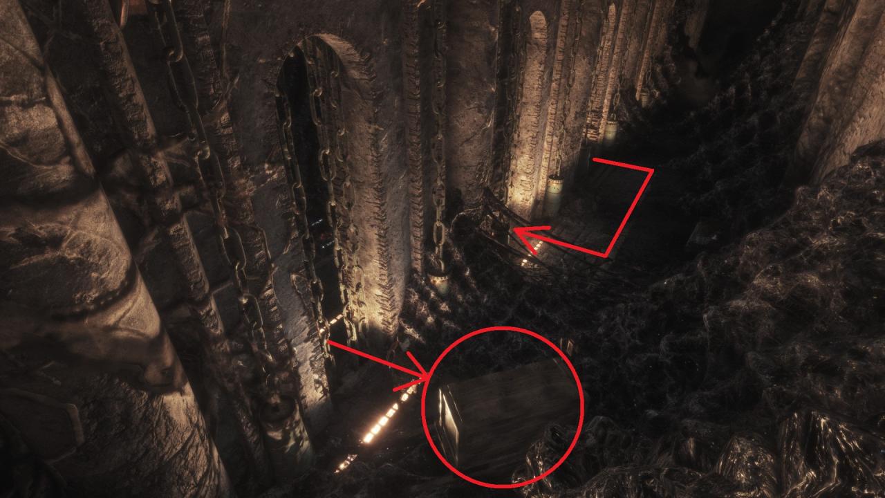 DO NOT jump down, but instead go to the left, through another pair of chains. In here you will find a secret chest.