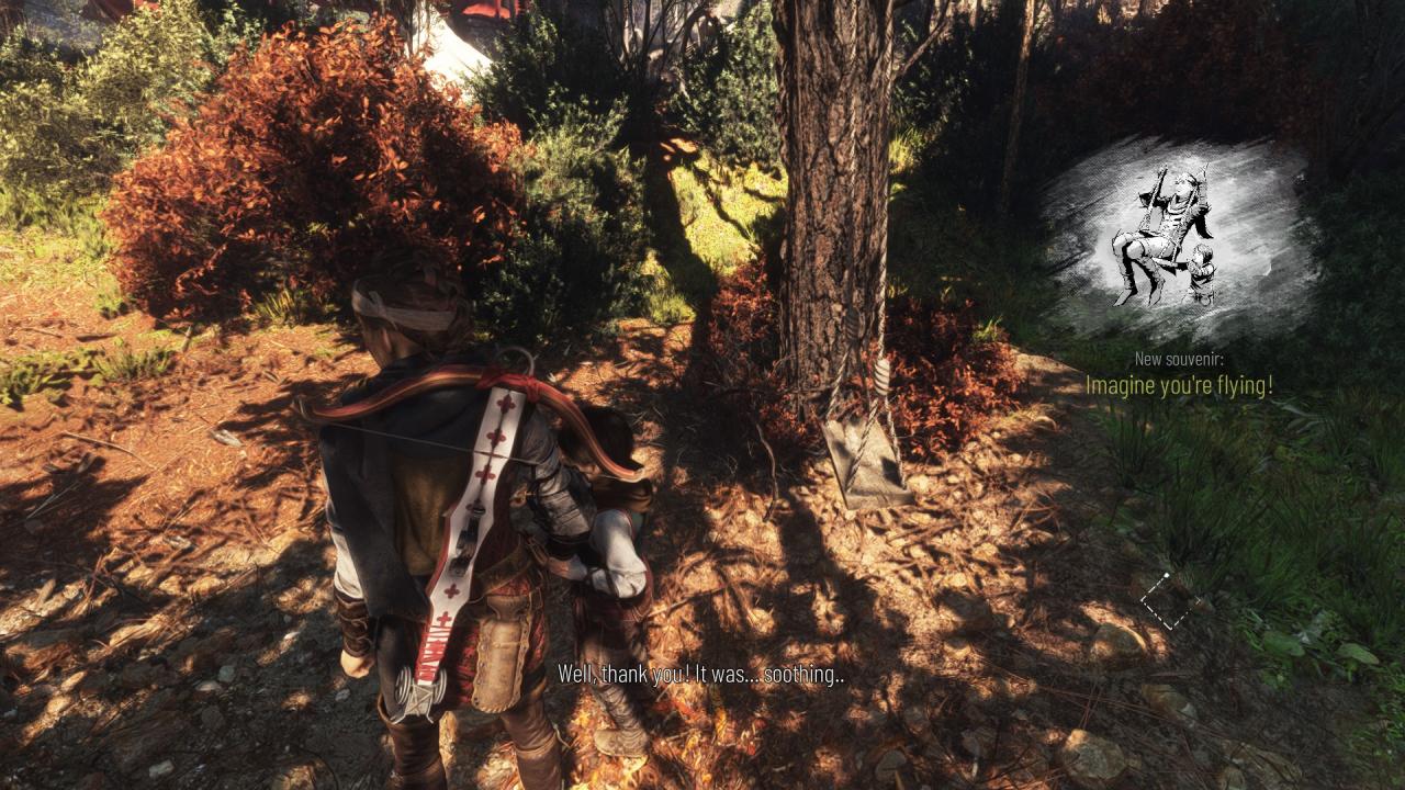 Interact with the pile of silk fabrics near the rail and the souvenir will unlock after the short dialogue.