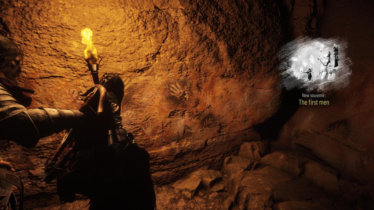Grab the torch hanging on sconce and walk until to find the end of the cave. There you will find hands painted on the walls with an interact on them.