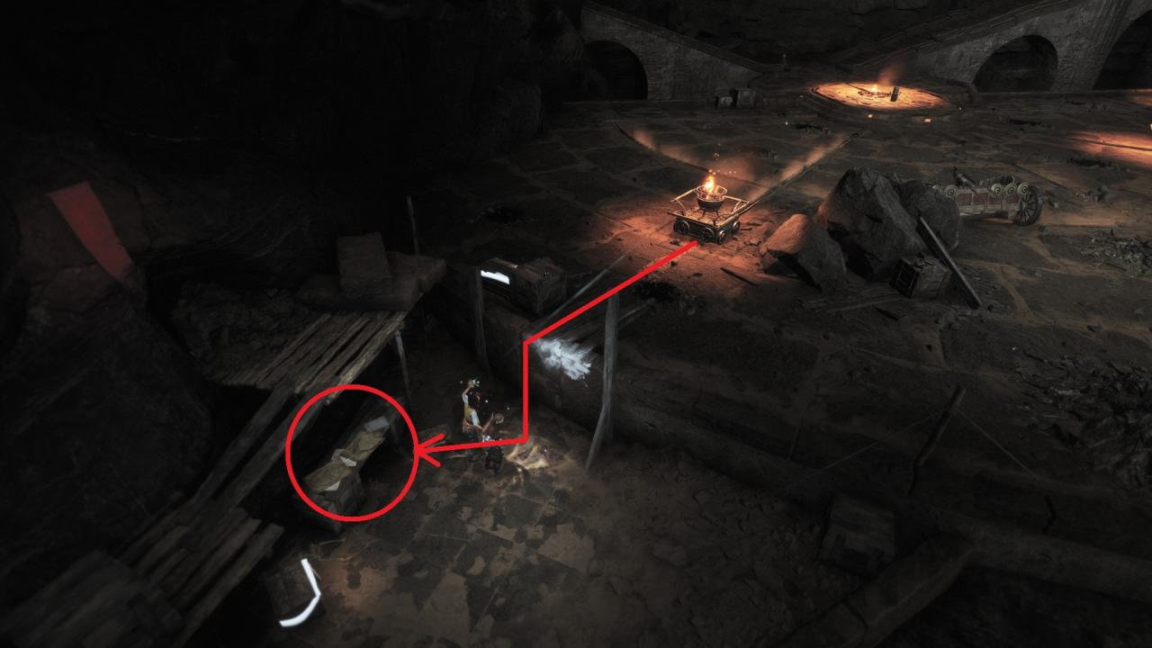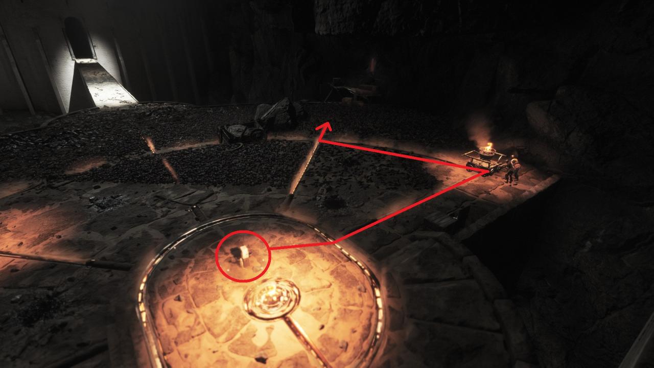 Can be collected during sub-chapter “Explore the underground area”, objective “Explore the underground area”, after reaching the big open chamber with carts with braziers on them, that can be pushed around. Pull the first cart on the right towards you by using the anchor point, then push it back until the end of the track, then grab it and push it to the left until reaching the big rock, then grab it again and move it to the right towards the ledge until you can no longer push it.