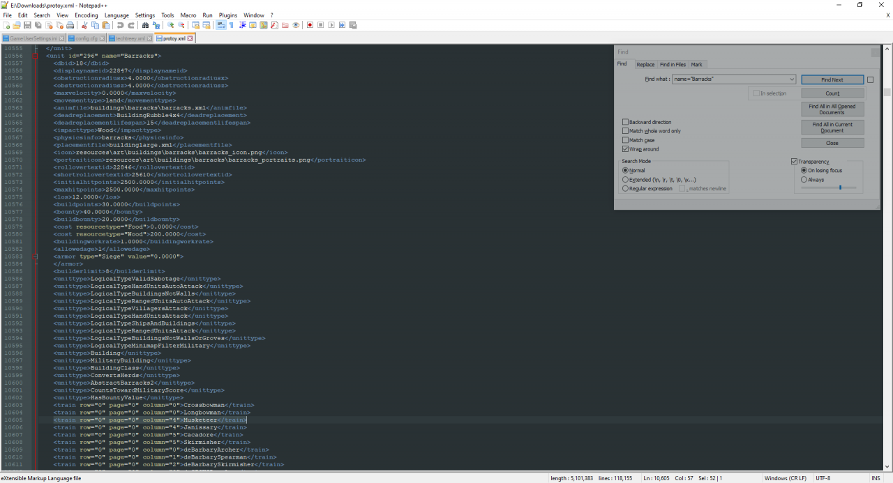 Note: For adding most new units you will also need to reference them in the protoy file as well, but in our case with the musketeer, it’s already under the barracks section there as you can see: