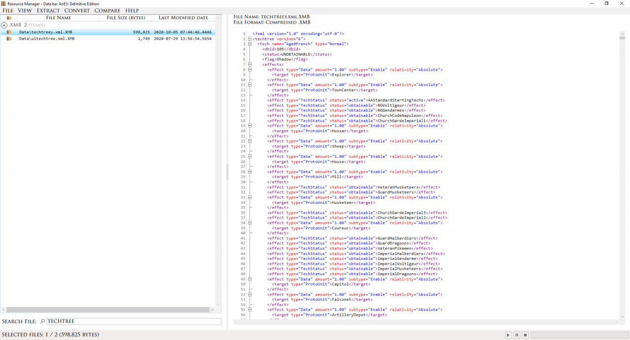 So, for my mod I needed to get the techtreey.xml.xmb file, which is located in the Data.bar file, which in turn is in the: