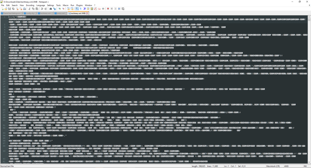 Afterwards you will need to convert your extract file(s) to an editable format which in our case is xml because the files are initially in xmb format which if you open in a text editor is just pure jibberish like so: