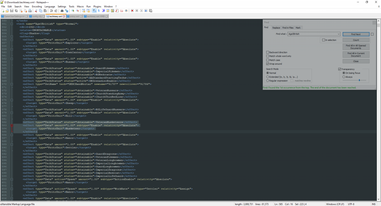 I first will look up for the “Age0British” and that is a 0 (ZERO) not an O (Oh) which will lead me to this section which enables the production of their musketeer and also attributed upgrades: