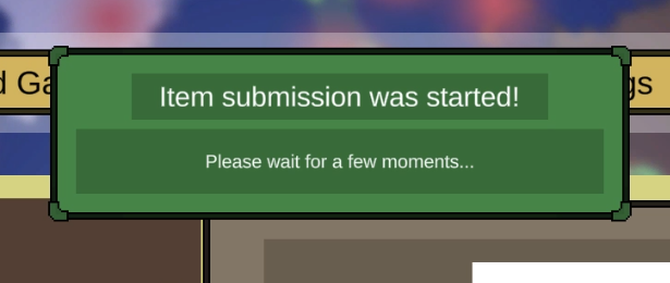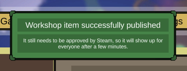After a few second, the upload should succeed. If you have Steam Overlay enabled, the game will open your item page for you. Otherwise you will see the success message above.