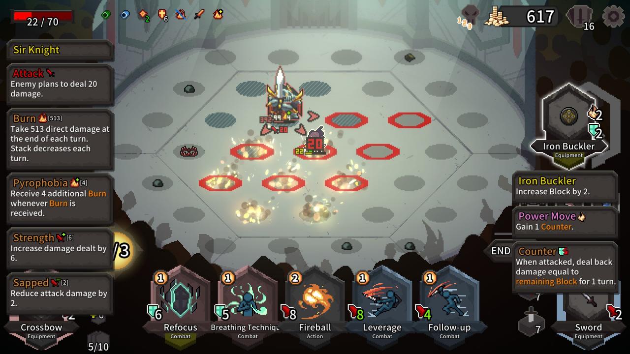 The first boss, for example, is something of a DPS check. You may be able to kite it with enough patience, but low-damage decks will run into the problem of him gaining more block and strength every time stun wears off, making it harder to avoid hits without multiple movement abilities and making each hit harder to endure. You are supposed to counter this by having enough damage to consistently break his block, damage his health, and kill him with few repeats. You can prevent him from gaining attack range and power entirely by using piercing attacks or attacks that otherwise ignore block, but if your damage is too low then you still won’t survive the next arena.