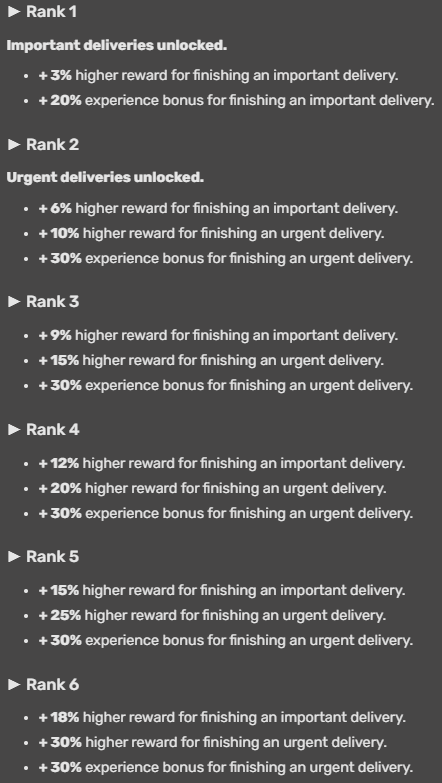 American Truck Simulator features an experience point (XP) and levelling system, which allows your character to develop and improve skills as you progress through the game, by complete deliveries, in order to unlock new abilities and cargoes. Most of the skills allow you to unlock more lucrative job offers. You can spend a new skill point after the player reaches a new level. The skills you can gain and improve are listed below.