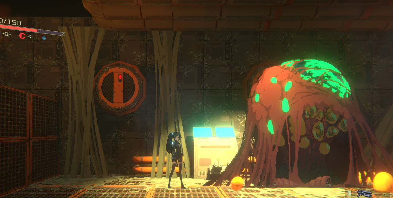 After entering the door you can reach an area with insect eggs, jump down, go right and then jump up to see the machine covered by insect eggs, open it to reveal the route of the aqueduct