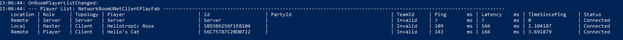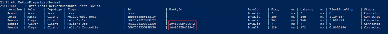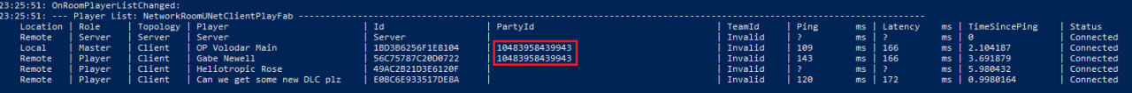 Same thing again, I don’t ready up until after I’ve checked the log. I see the PartyId populated on the first two players and leave the lobby.