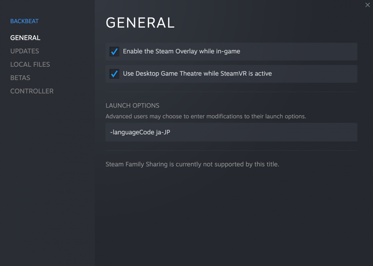 English is the standard language used in Backbeat but it does also have Japanese locale available. You can manually choose to run in English or Japanese by adding the Steam Launch Options -languageCode ja-JP or -languageCode en-US, respectively.