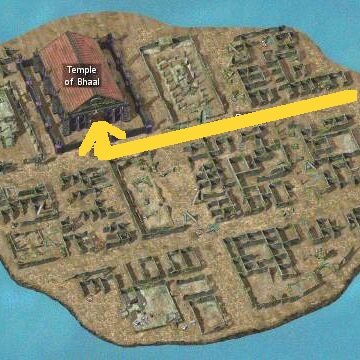 Once again, follow the yellow line. There is another bounty hunter group which you can sneak right by, but by now you should be able to wipe them out easily. Once you pass them, enter the Temple of Bhaal and confront Sarevok and his closest allies.