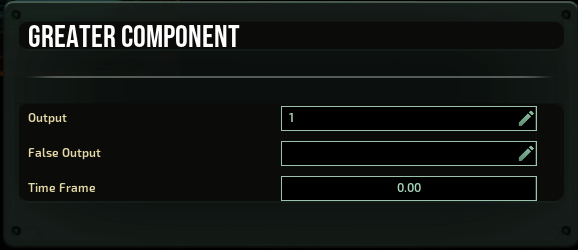 Compares the value from “Signal_In1” with the value from “Signal_In2”. If the first value is higher than the second, then the value written in “Signal_Out” is output. If the first value is less, “False Output” is output. “Time Frame” is the value of the time interval that the component will hold the value received at the input, and will compare it to the second value if it has passed no later than the set interval.