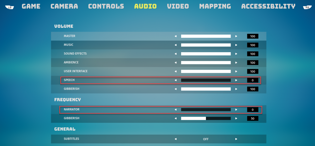 Subtitles under “General” are subtitles for narration outside of gibberish talks. you’d better have it turned on, as the narrator does have some informative information about certain missions from time to time.