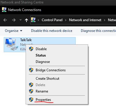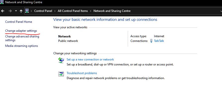 3. Select “Network and Sharing Centre” then “Change Adapter Settings”