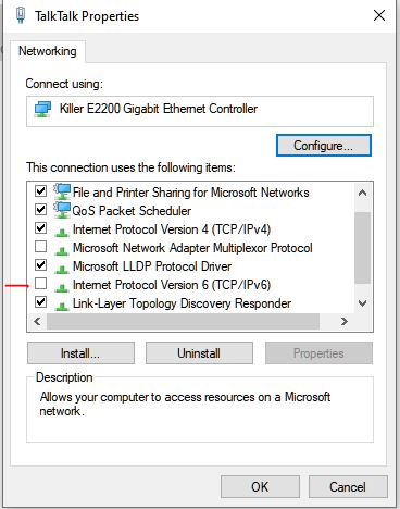 5. Uncheck the IPv6 option then click ok – Note this may disconnect you for a moment, good practice is to then reboot: