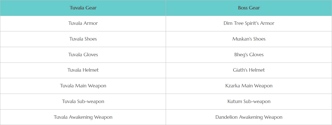 Here are the boss gear that can be exchanged from a Tuvala gear using the [Season] Boss Gear Exchange Coupon.