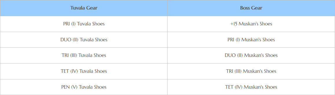 Tuvala gear used for [Season] Boss Gear Exchange Coupon must be between PRI (I) and PEN (V).