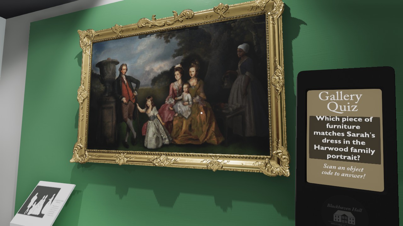 2. Which piece of furniture matches Sarah’s dress in the Harwood family portrait?