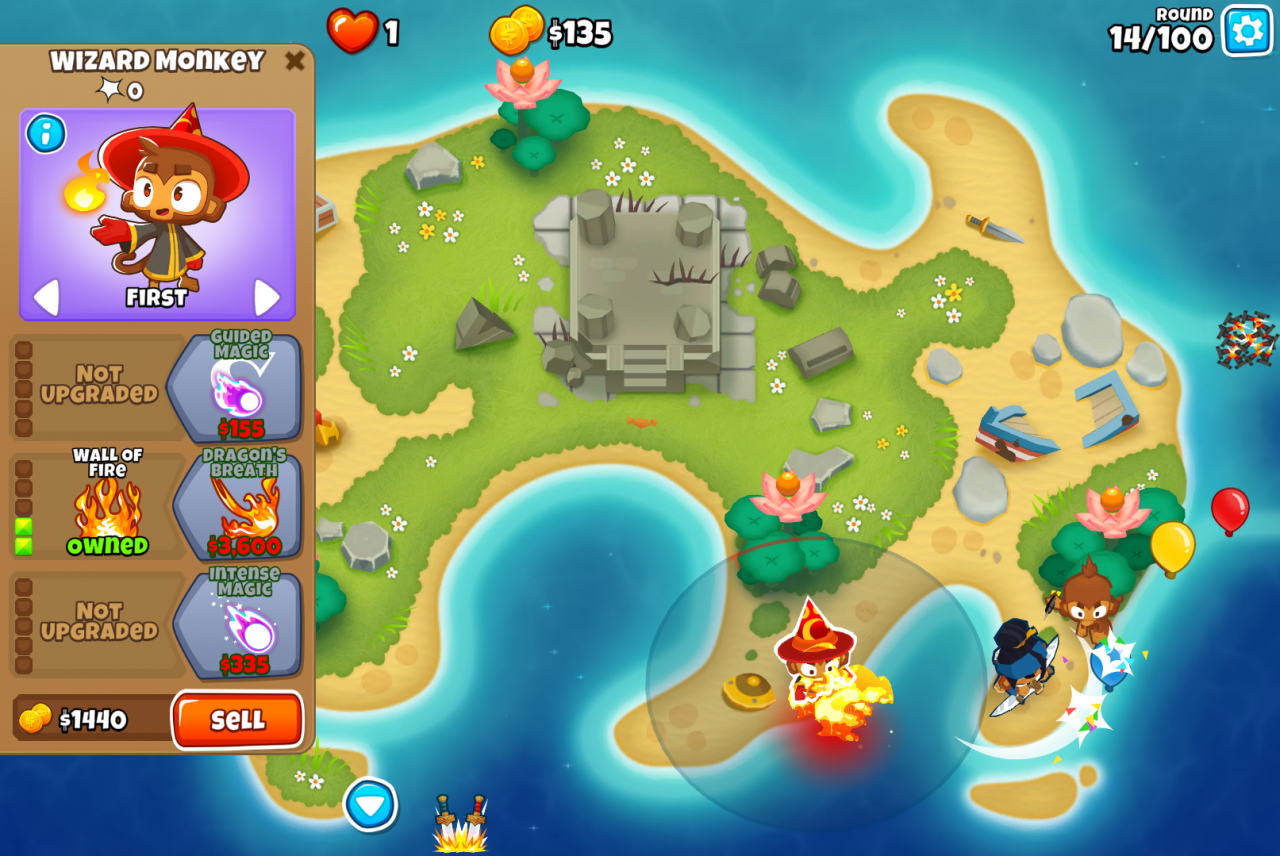 - Buy a 020 Wizard at entrance, but be careful because we will upgrade him into Prince Of Darkness (POD) so IMPORTANT make his future POD range not to be in the end of the track so it doesn’t affect the golden Bloon. A good example of this is in the very images below in Lotus Island as the “ghost ballons” will be spawning only at half of the track.