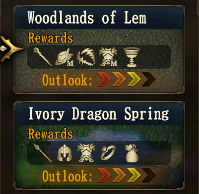 The in-game quest view lists possible rewards for each quest, as well as the overall bonus to success based on the Rune Knight selected. The “outlook” is increased based on the tier of your Knight’s class, plus a bonus based on class and location. In addition to the listed rewards, there are also monster promotion items that can only be found at specific locations.