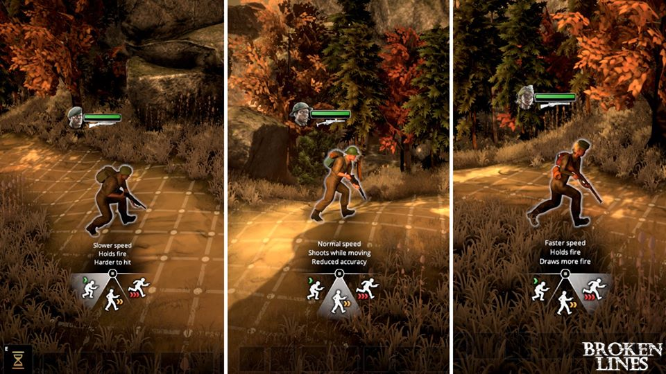 As you can see from the video, the player sets a move command for a soldier by clicking on the ground. At that point, they are given three choices, a slow walk (crouch mode), regular walk, or a run. Each movement option will have different effects on the squad member.