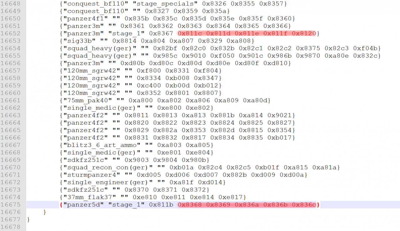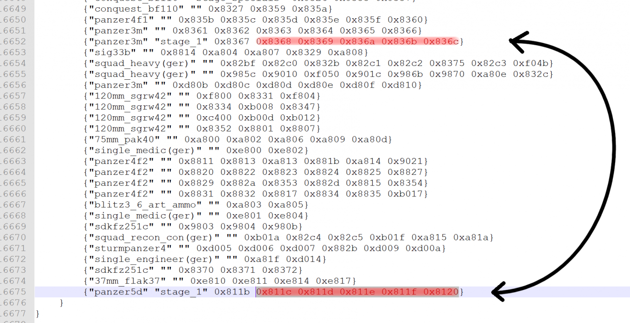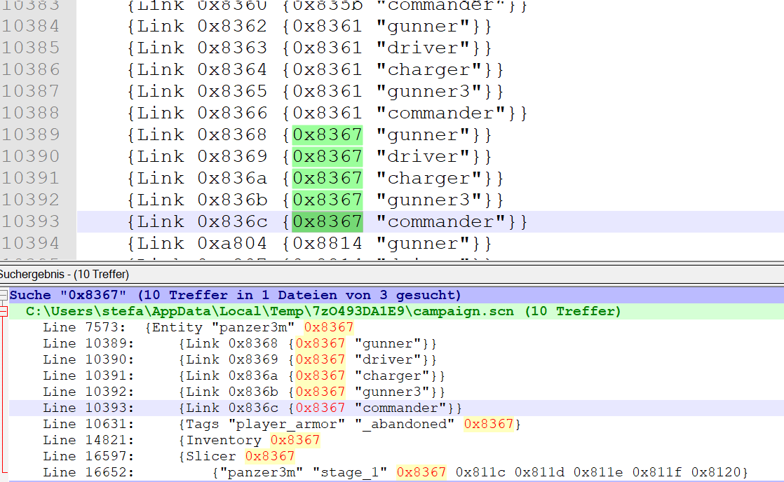 And here you have both tanks. The first number behind “stage_1” (0x8367and 0x811b) is the ID of the tank. You probably should write that down somewhere. And the 5 numbers after that (eg. For the Panzer III 0x8368, ..69, ..6a, ..6b, ..6c) are the 5 crew members.Easy, isn’t it?