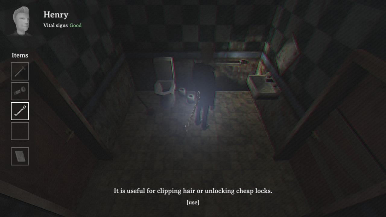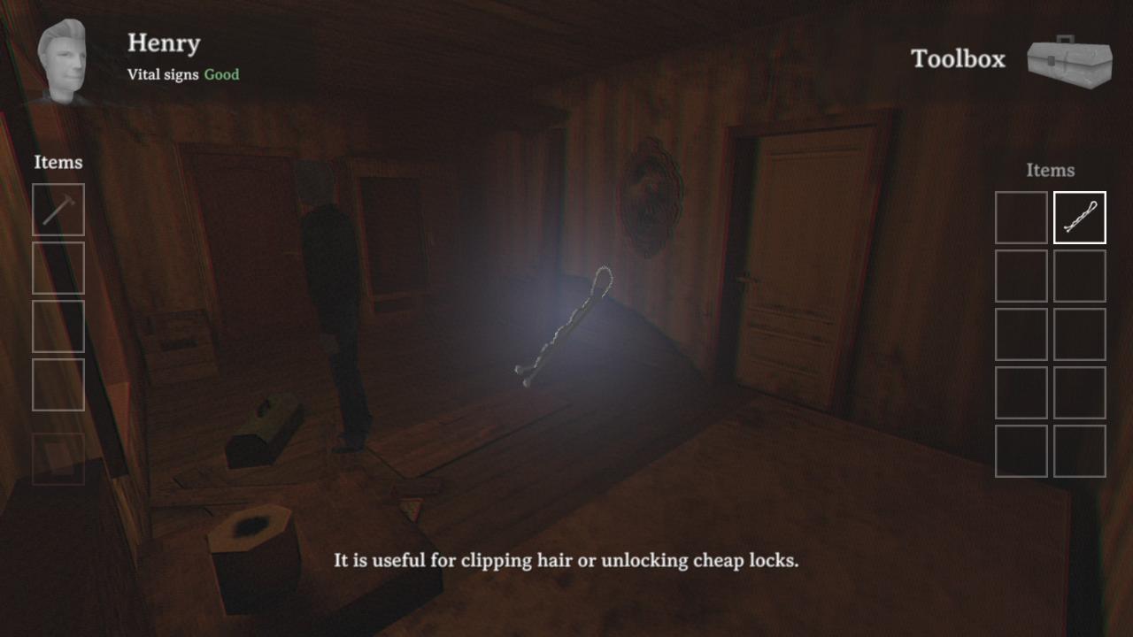 The Hammer is the first Item you’ll see, it’s just lying around near the player, take it and then check your tool box (get near it and press ‘e’), there you’ll find a bobby pin. Since the player only has 4 slots on default and 3 on Hard Difficulty, you shouldn’t forget the tool box is your friend.