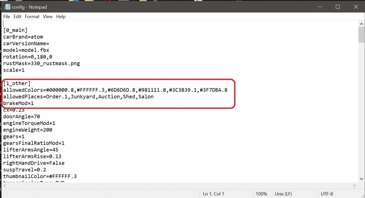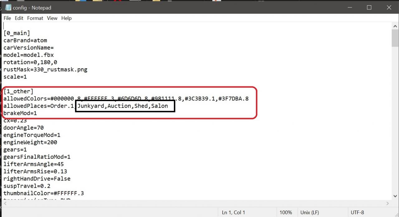 Tip: Copy the Junkyard,Auction,Shed,Salon Line it will make it easier to past it in the config file of every car.