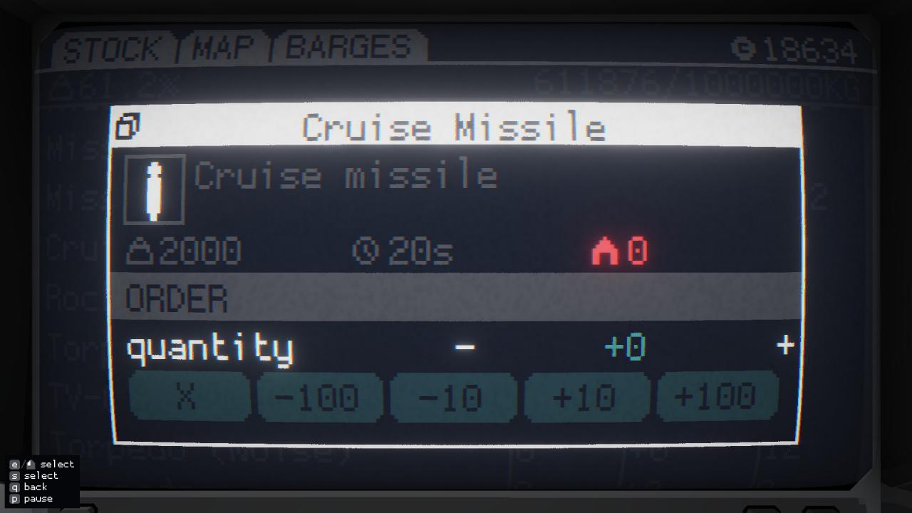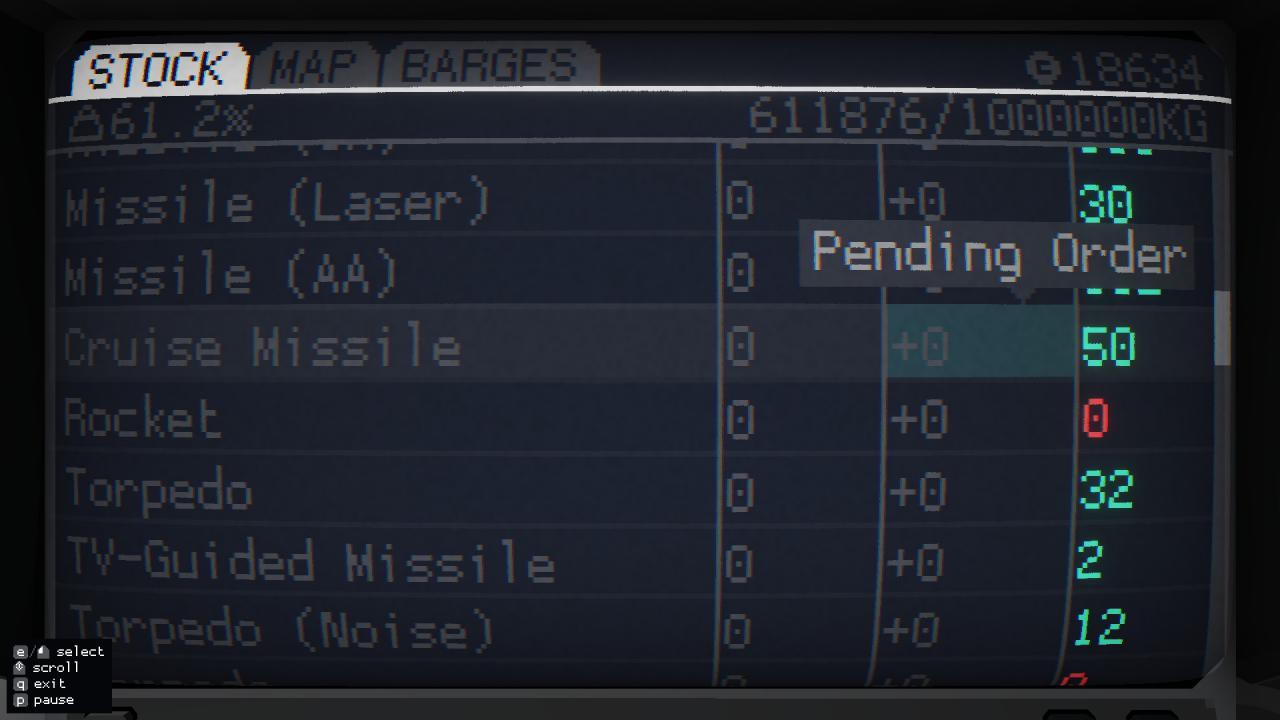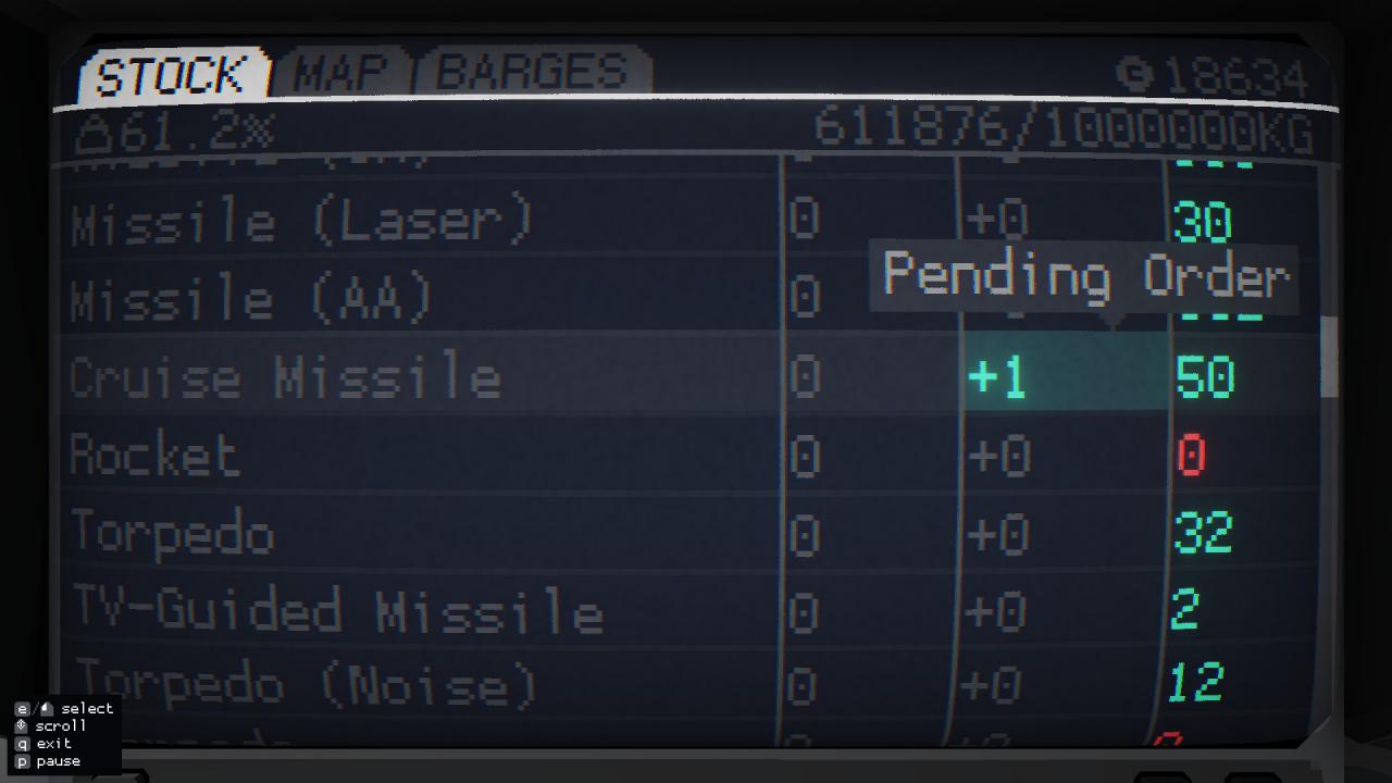 Items are ordered from the “Stock” screen. Order only what you will need until the next resupply, or you may get 50 AA Missiles instead of the critically needed fuel.