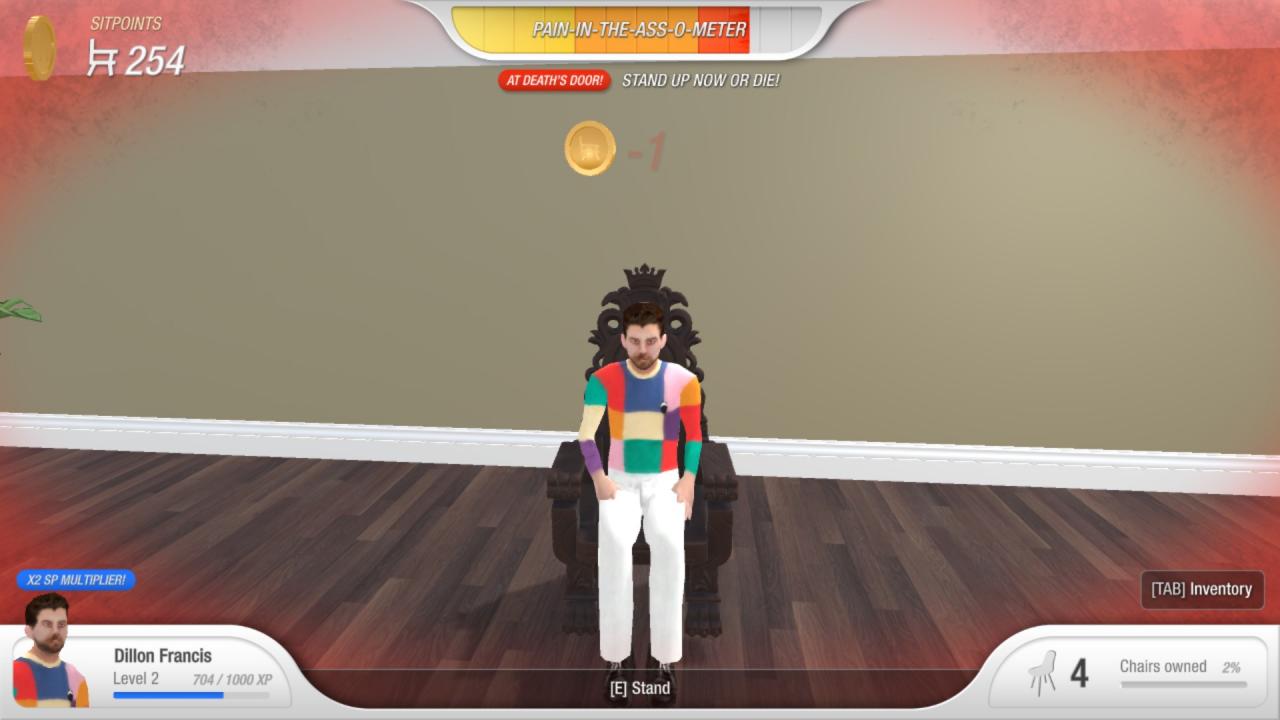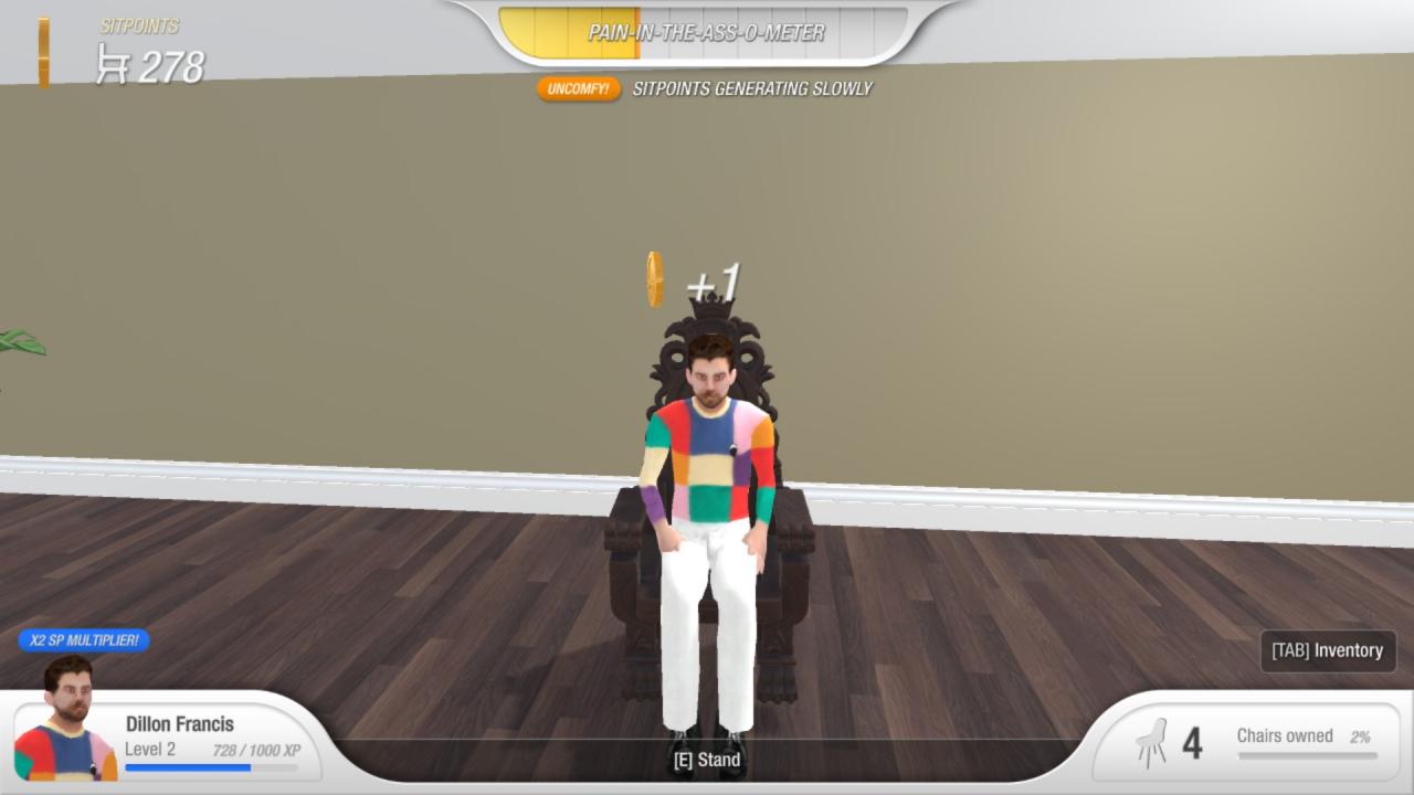 In the “uncomfy!” Area you only get 1 coin and your multiplier is no longer effective. So there is no point in sitting any further. Stand up and sit down again when the O-METER is empty.
