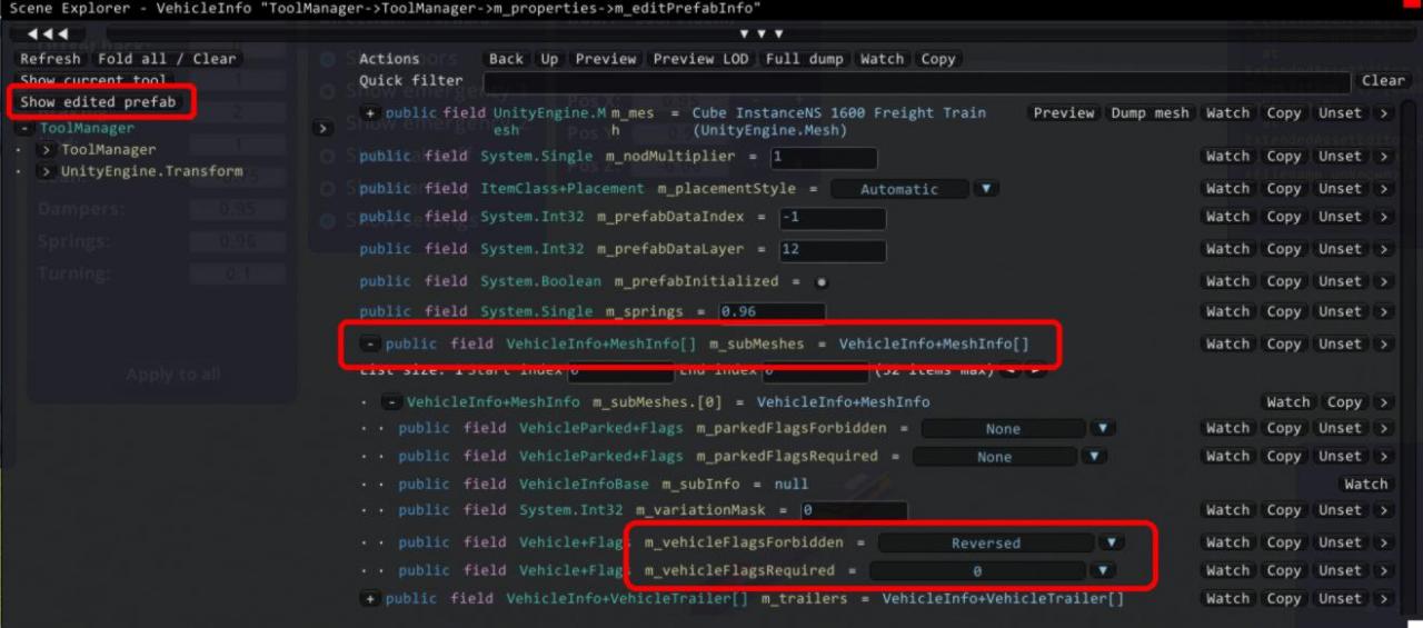 In the upper-left corner of the “Scene Explorer” window, click on the Show edited prefab button. This will cause the “Scene Explorer” to focus on the locomotive. Now, scroll down until you see this line of information (it will probably be near the bottom of the window):