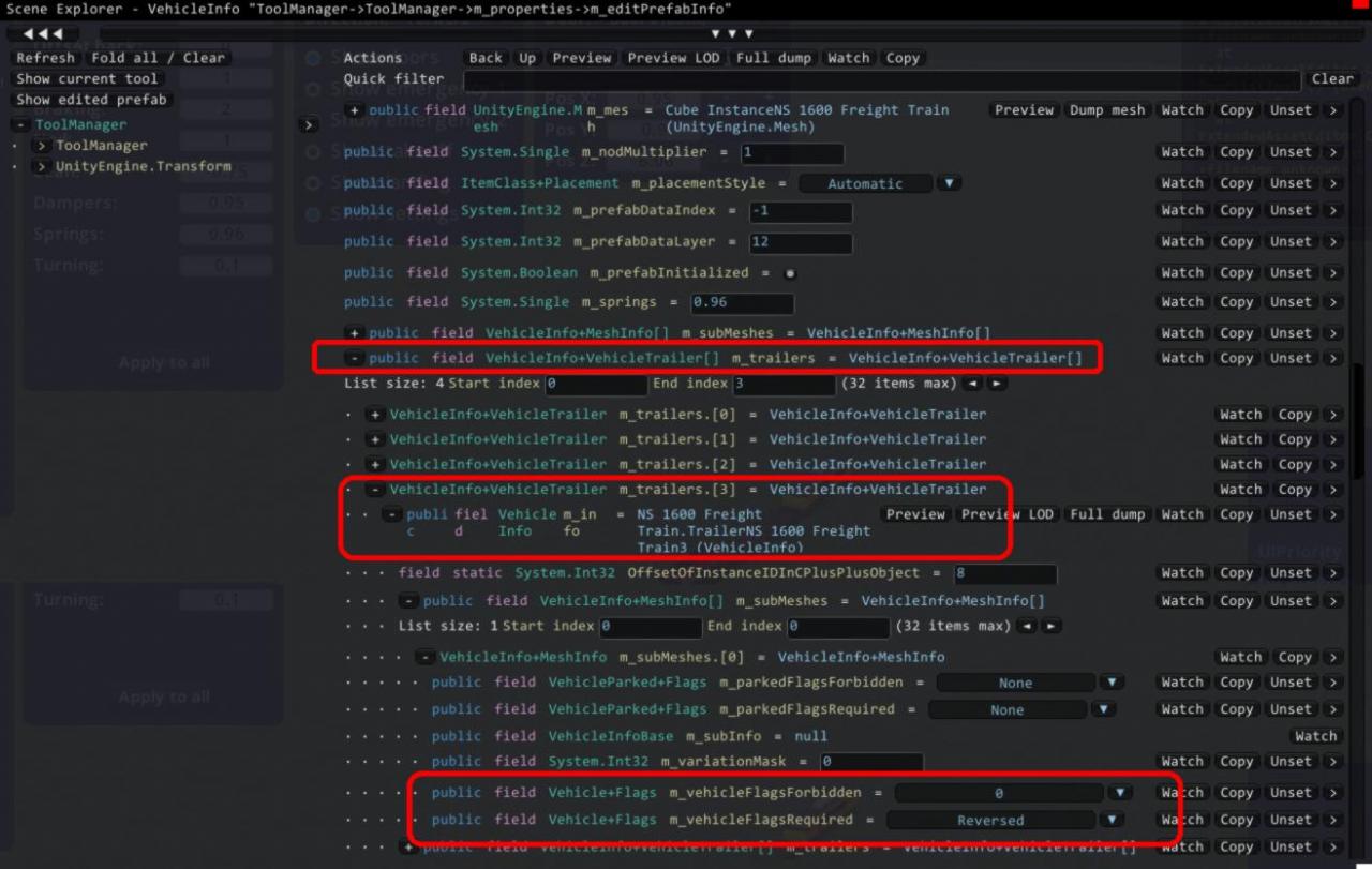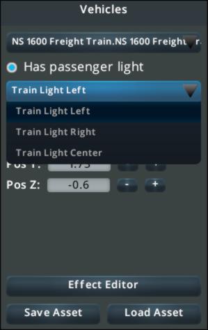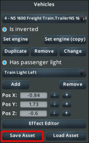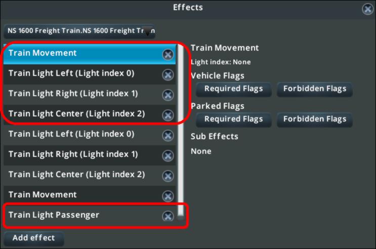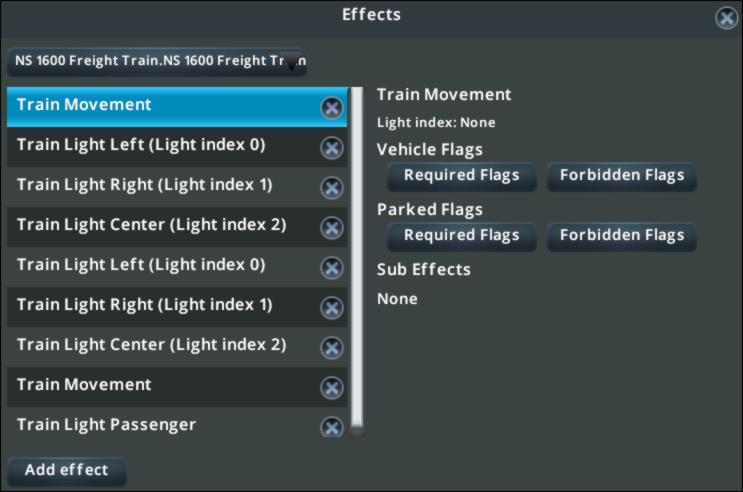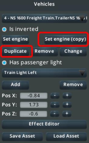 - Yes, they are. But, remember that, when EAE saves the asset, it will rename all of the trailers to use its own naming scheme. Therefore, it is best to save the asset, exit the Asset Editor, reenter the Asset Editor, load the new/modified asset, and determine the names for the various vehicles. To work with Vehicle Effects, you’ll need the full name (ex: “MyCustomTrain.TrailerMyCustomTrain0”). In addition, you’ll need to remember to specify the proper inverted/reversed flags in the Vehicle Effects XML file for each locomotive. For more information on using Vehicle Effects, set the various tutorials included on its Workshop page.