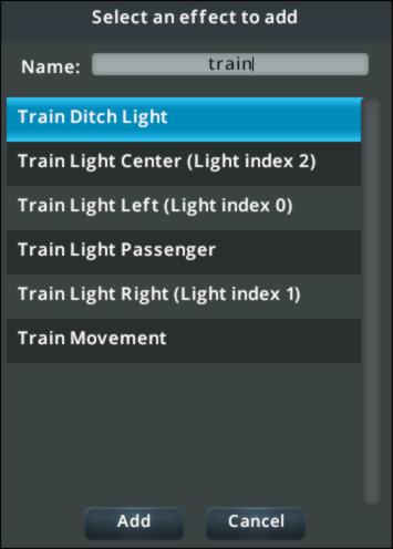 Select Train Movement and then click on Add to add the effect to the list. Repeat this step for a second Train Movement effect and then two copies each of the various “Train Light *” effects, Remember, if your train doesn’t have a center (or left, etc.) headlight installed, you don’t need a corresponding effect. When done, you should have two copies of each effect.
