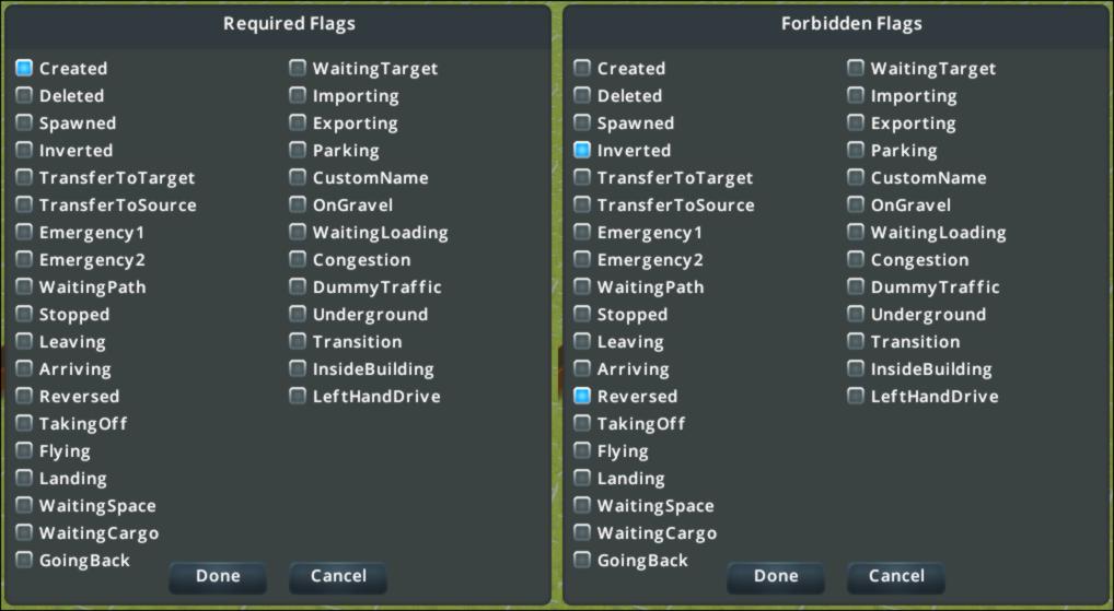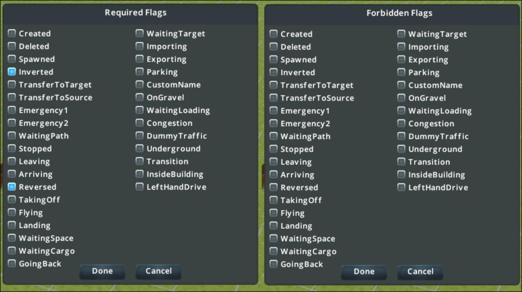 Once you have all of the effects listed, select the first effect in the list, and then click on the Required Flags button underneath Vehicle Flags on the right. Check the Created box and uncheck all of the rest. Click on the Done button. Then click on the Forbidden Flags button underneath Vehicle Flags on the right. Check the Inverted and Reversed boxes and uncheck all of the rest. Click on the Done button. When done, the two sets of flags will look like this: