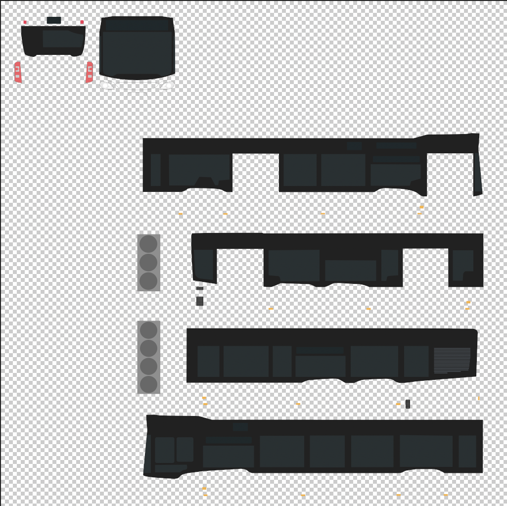 This texture will be downloadable ingame in the paint shop and will serve as a reference for external repaints. All surfaces and details of the bus must be completely mapped on it. The areas with the base color or the areas that should be paintable must be white. The background must be transparent.
