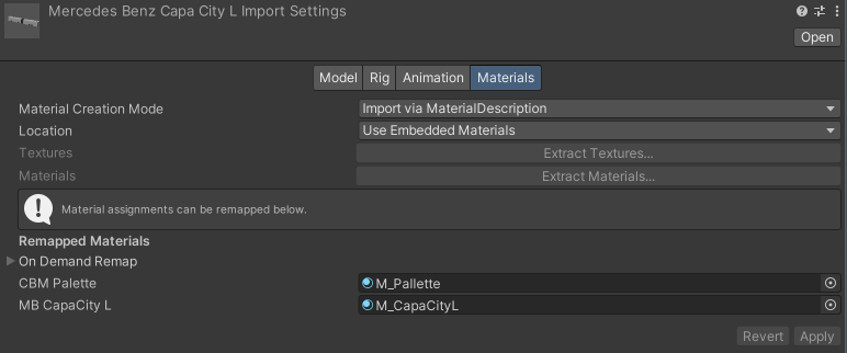 - Model: Drag the created bus (e.g. fbx file) into the Models folder. Set the model and materials tab as follows and confirm the settings again with “Apply”: