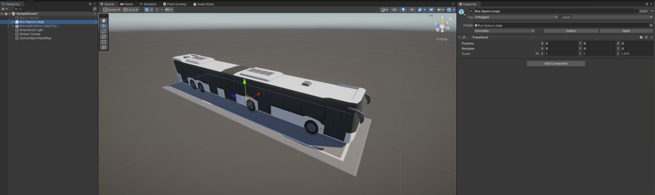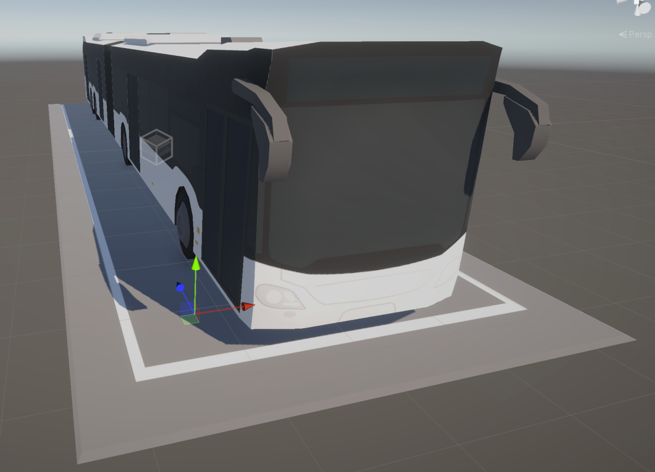 - Now change the position of the bus object in the scene and scale it so that the bus stands correctly on the parking space and does not look beyond it. In addition, the front of the bus on the parking space should also look forward, as shown in the picture above. If the bus is faceing the wrong way, the Y rotation can be set to 180.