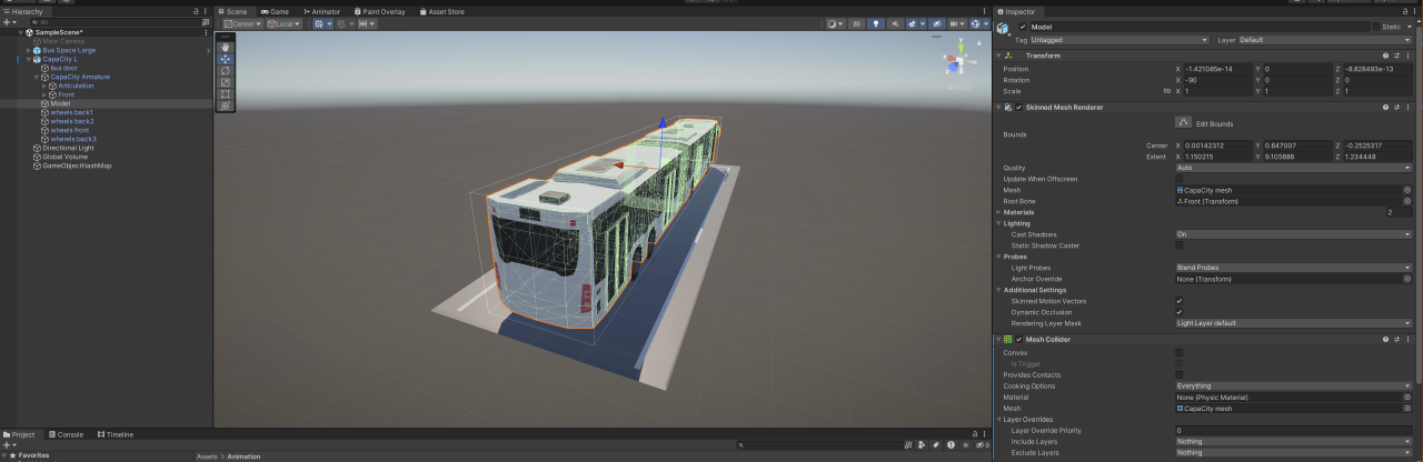 - Drag the bus model into the Unity Scene and set the position coordinates to X=0, Y=0, Z=0.