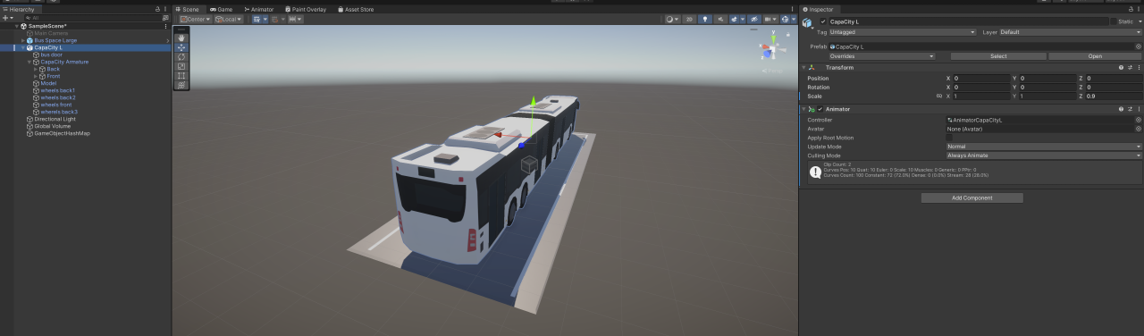 - Add an animator to the parent GameObject of the bus and select the previously created animator controller as the controller.