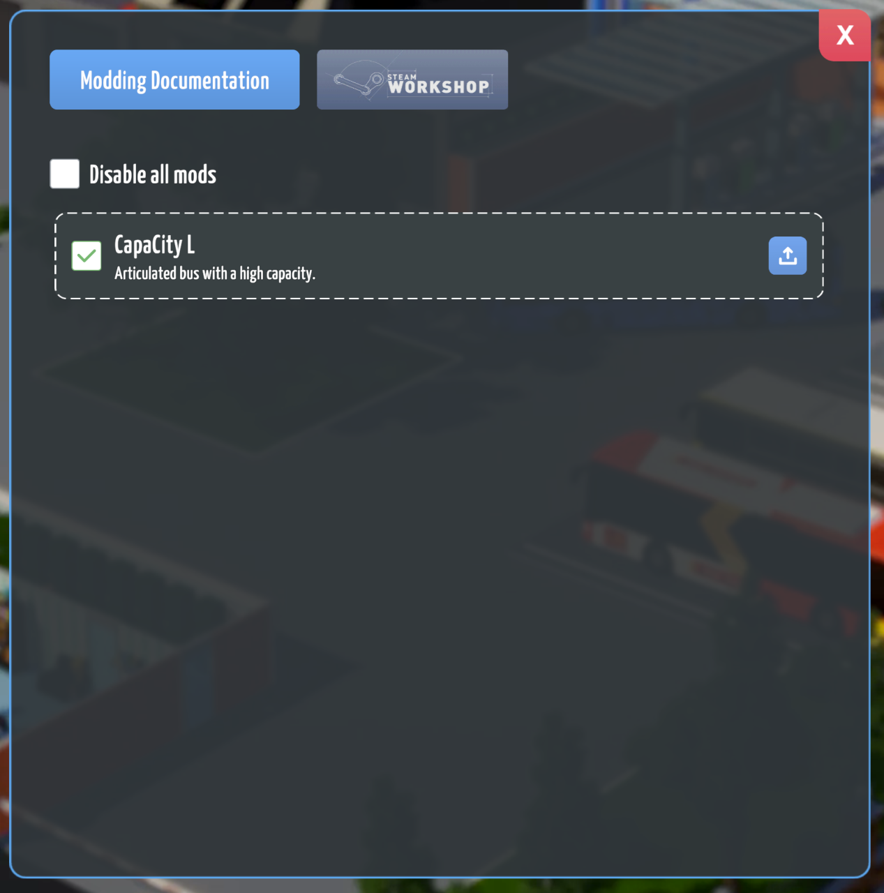 If everything is working correctly, the bus can be shared in the Steam Workshop via the modding form in the main menu. Just click on the blue upload button.