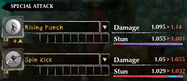 To find out which stances and special attacks are affected by which attributes, look at the color bar below the damage and stun details. Above we can see that the Rising Punch is greated improved by Aggressiveness (purple), while the Spin Kick is mostly improved by Power (red).